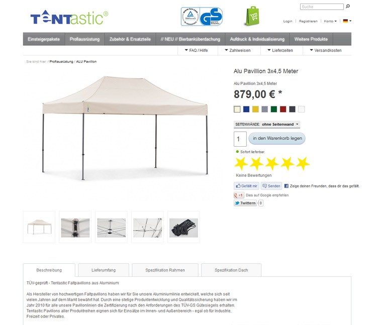 Mit dem OpenSource Online Shop "Oxid eSales" wurde für Tentastic, einen Hersteller von Faltpavillons, ein Webshop realisiert. Per Paypal kann der Kunde bequem seine Bestellung bezahlen.