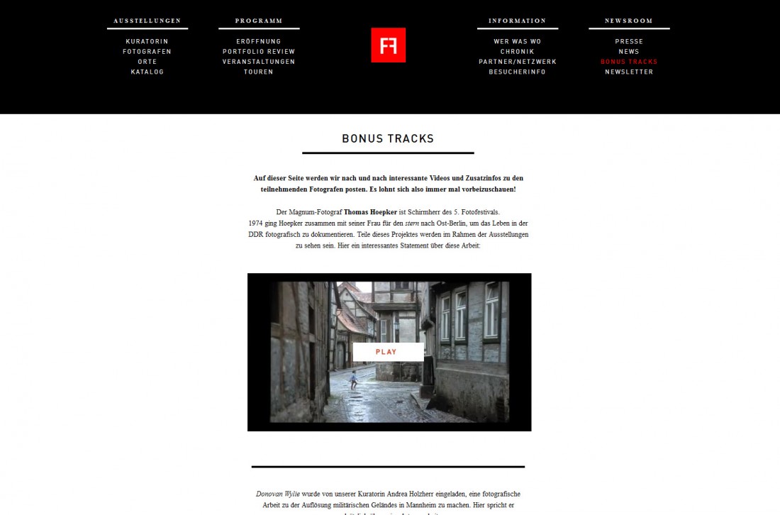 Das Fotofestival Team kann die gesamte Seite über platoCMS mit Inhalten, Texten und Bildern pflegen. Über besondere Module können Künstlerprofile, Reviewer, Newsletterabonnenten, News uvm. bequem in den beiden Sprachen Deutsch und Englisch aktualisiert werden.