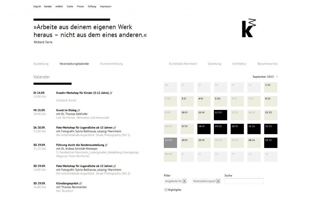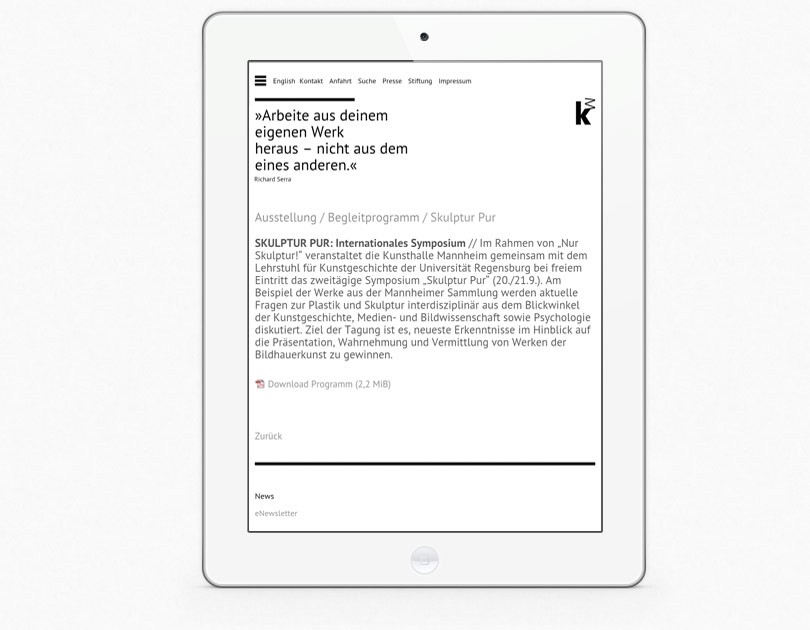 Die Website wurde komplett von Jäger & Jäger überarbeitet und durch codepoetry mit Contao realisiert. Das Layout weist dabei auf allen Geräten die passende Größe vor. Ein Galeriemodul, Ausstellungsmodul und Veranstaltungsmodul sowie der Newsletter, ein geschützter Pressebereich und die Mehrsprachigkeit sind nur einige der Features der Seite.