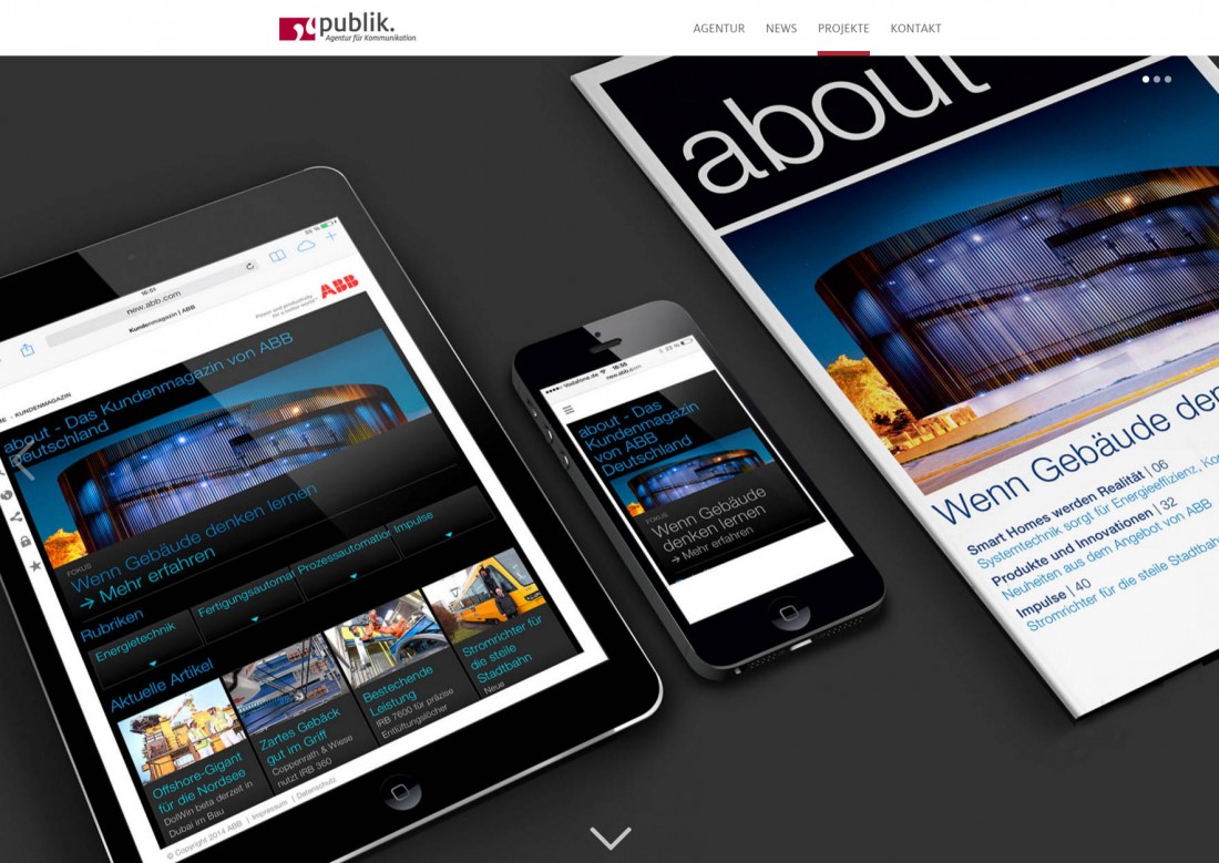 Das responsive Layout wurde zusammen mit Publik entwickelt. Über platoCMS können die Redakteure News, aktuelle Projekte und die gesamten Inhalte pflegen.