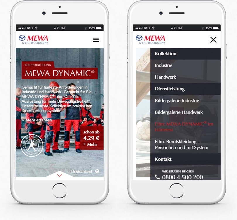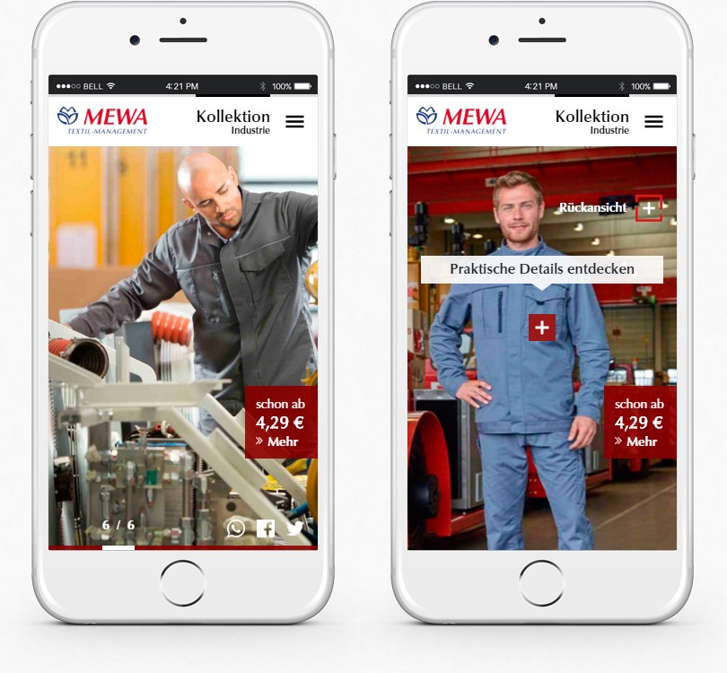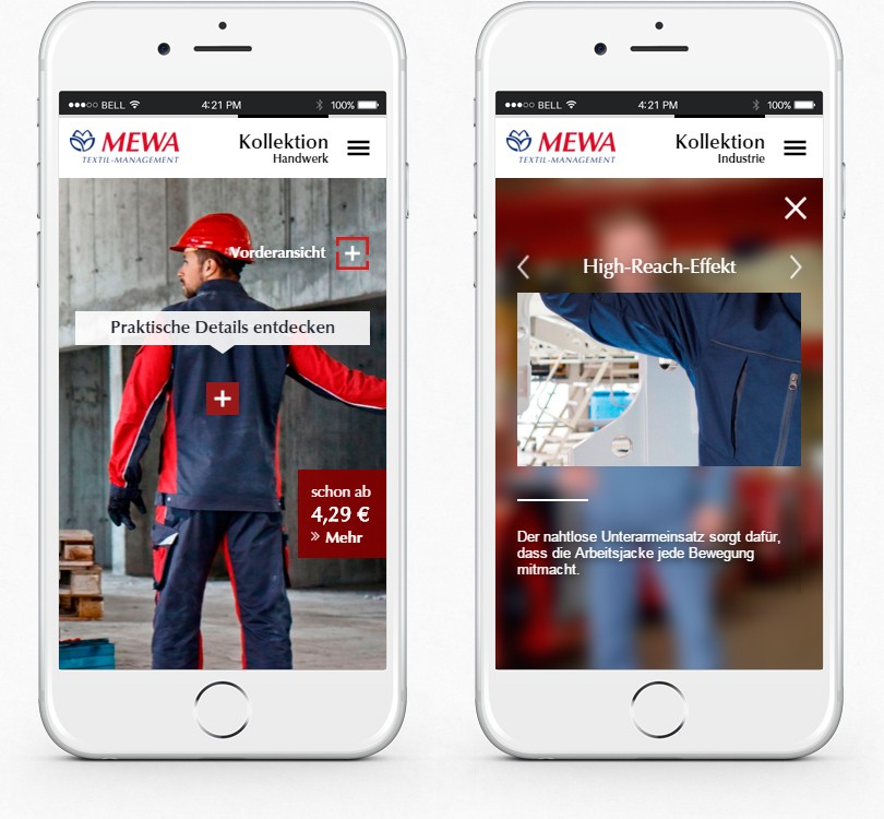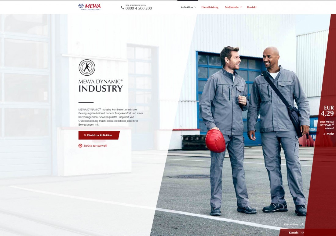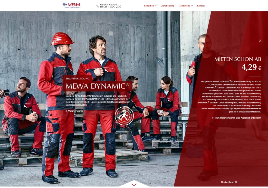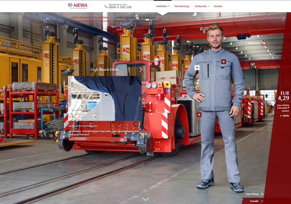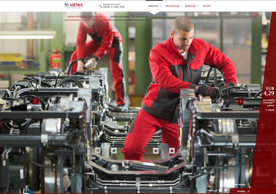 Für den Arbeitsbekleidungshersteller MEWA wurde eine komplexe Microsite als Javascript basierte Slideshow programmiert.