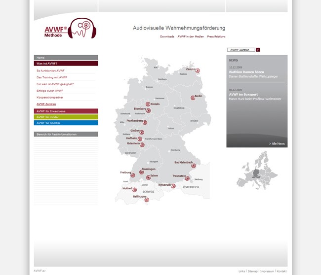 Hier können sich interessierte auch über die einzelnen Niederlassungen/Zentren informieren sowie über die Methode der visuellen Wahrnehmungsförderung. Das Design wurde von ultrabold entwickelt.