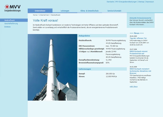 Das Industrieheizkraftwerk Korbach der MVV Energiedienstleistungen erhielt einen neuen Internetauftritt im typischen Design des MVV Mutterkonzerns.