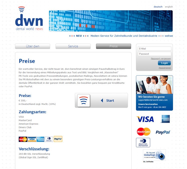 Die dNA zählt zu den größten Dental-PR-Agenturen in Europa und erhielt von codepoetry ein Werkzeug, mit dem Kunden Ihre aktuellen Neuigkeiten mit einem News-Formular übermitteln können. Die Bezahlung erfolgt via iPayment oder Paypal.