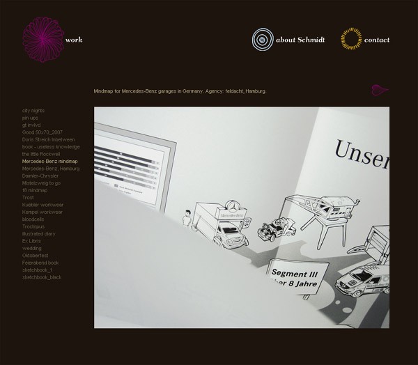 Der Designer Thorsten Schmidt kann in diesem Portfolio sein ganzes Können präsentieren: genauso wie das kleine CMS Modul zum verwalten seiner Arbeiten. Web Publishing leicht gemacht...